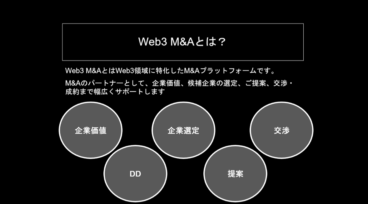 「Web3 M&A」とは、Web3に特化したM&Aプラットフォームです。自社の技術にNFTやブロックチェーン技術を用いてさらに既存事業を発展したい事業者と、優れたブロックチェーン技術を持っている事業者がマッチングし、さらに社会がWEB3により加速して発展することを目的としています。