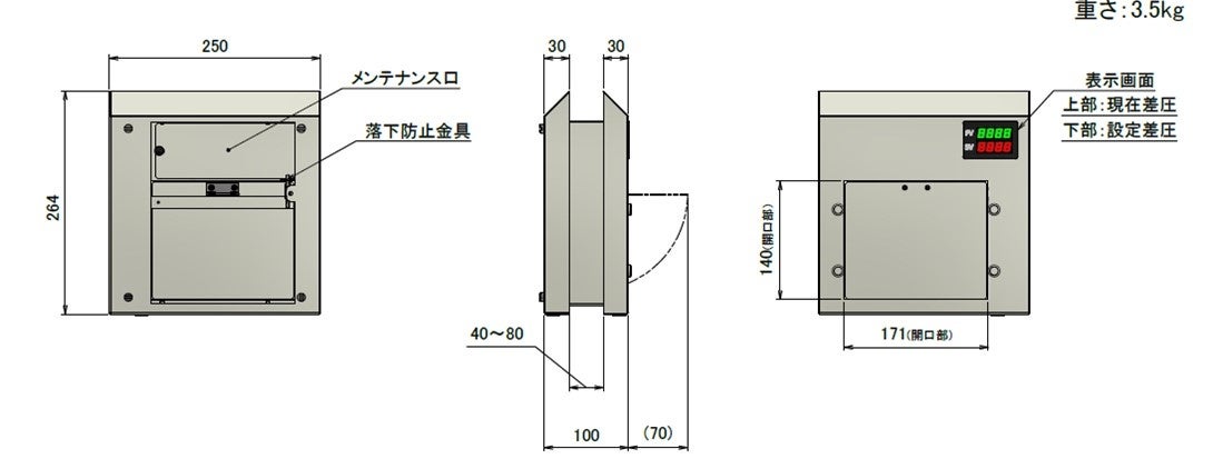 設置にはダクト工事等大掛かりな工事は不要で、室間の壁面に設置し必要な室間差圧を設定するだけで簡単に設置調整していただけます。(別途 給排気装置は必要)