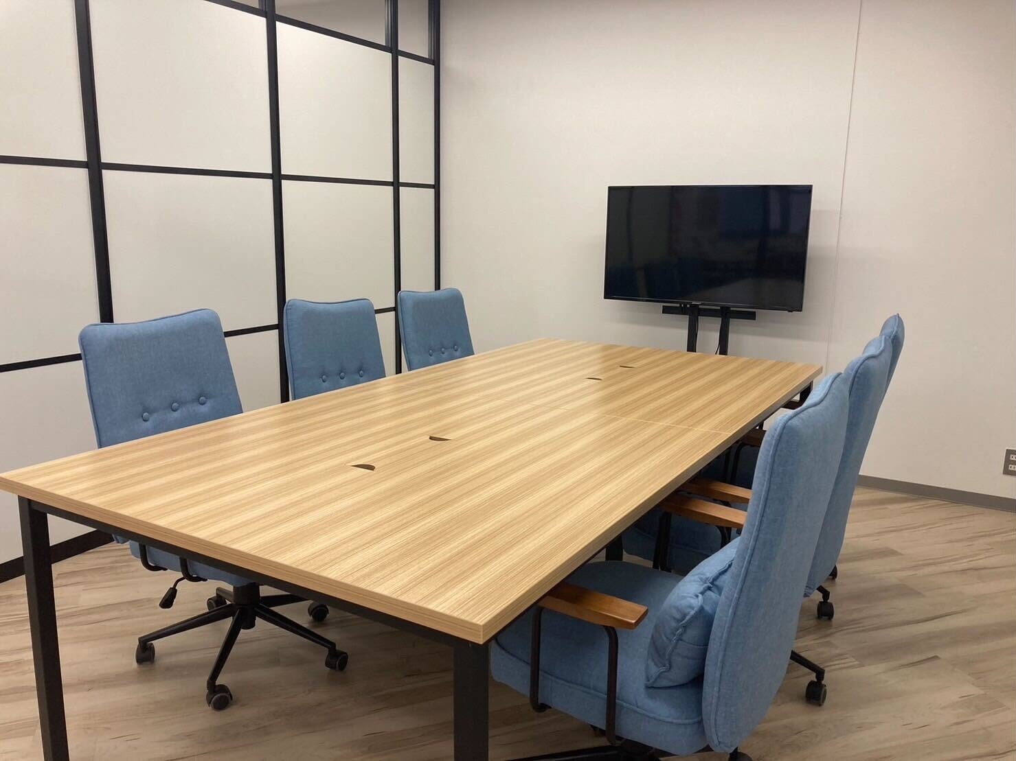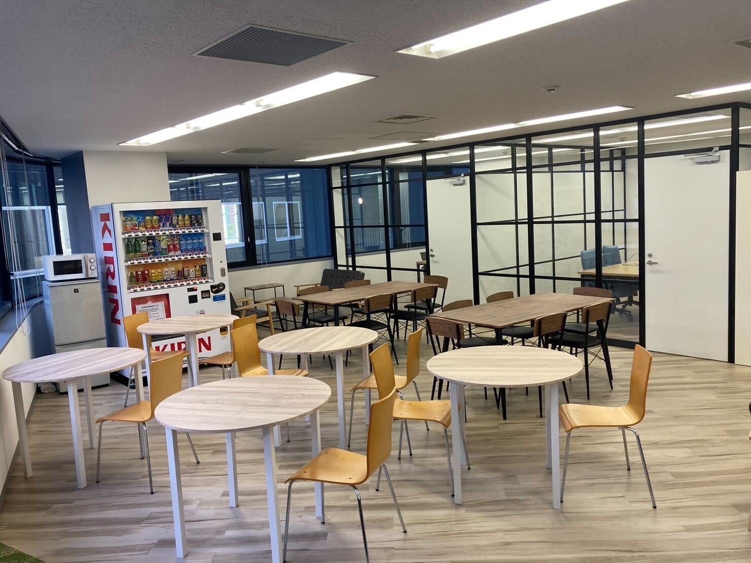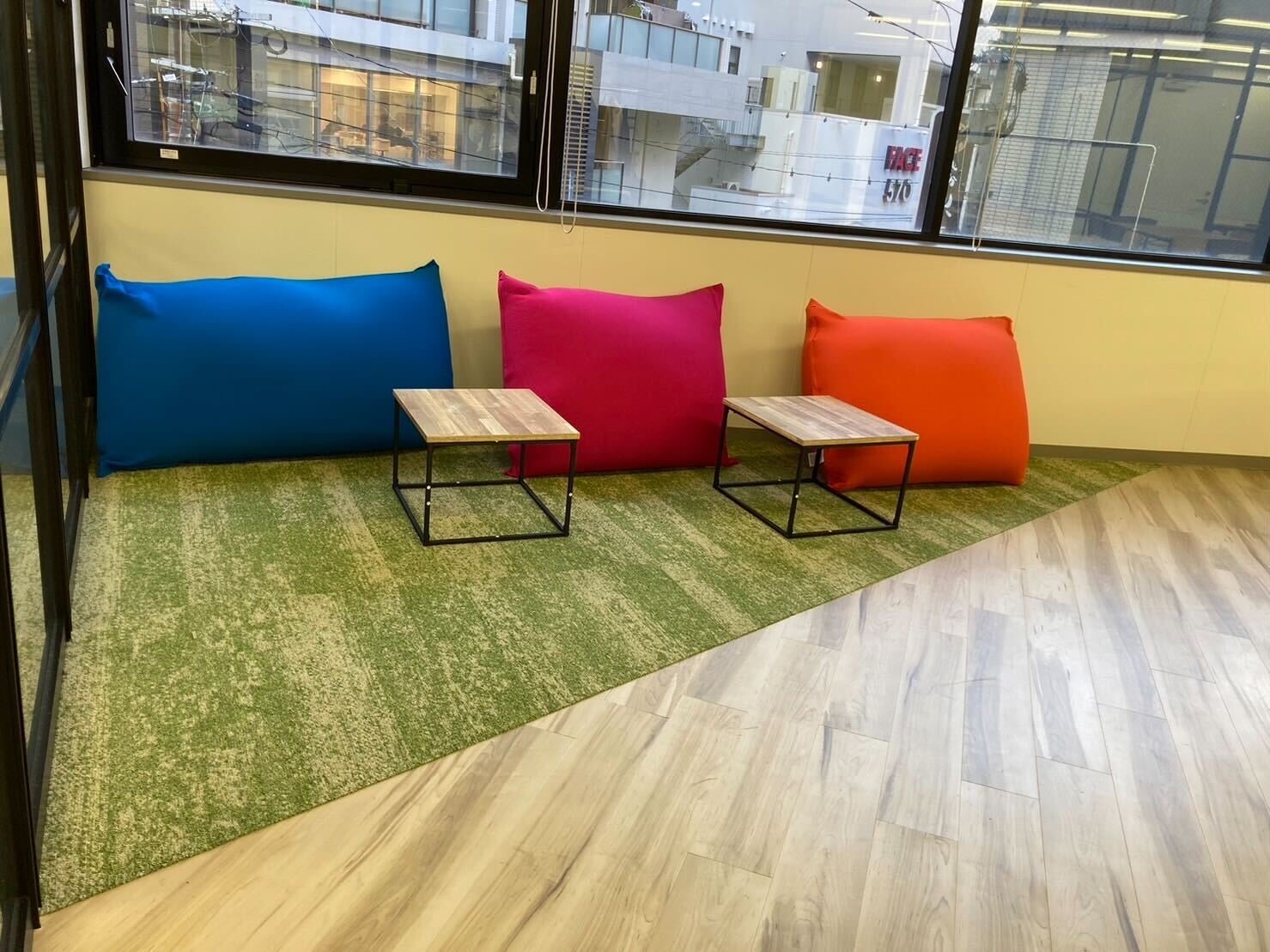 熊本ラボは、エントランスのスポットライトが当社のロゴを明るく照らし、当社ロゴの緑色に合う⽊⽬調のタイルカーペットにてお出迎えいたします。また、休憩室は、おしゃれなカフェをイメージした落ち着いた空間となっており、ダイニングテーブル、ソファ、Yogibo、芝生など誰でも休みやすい空間を提供しています。