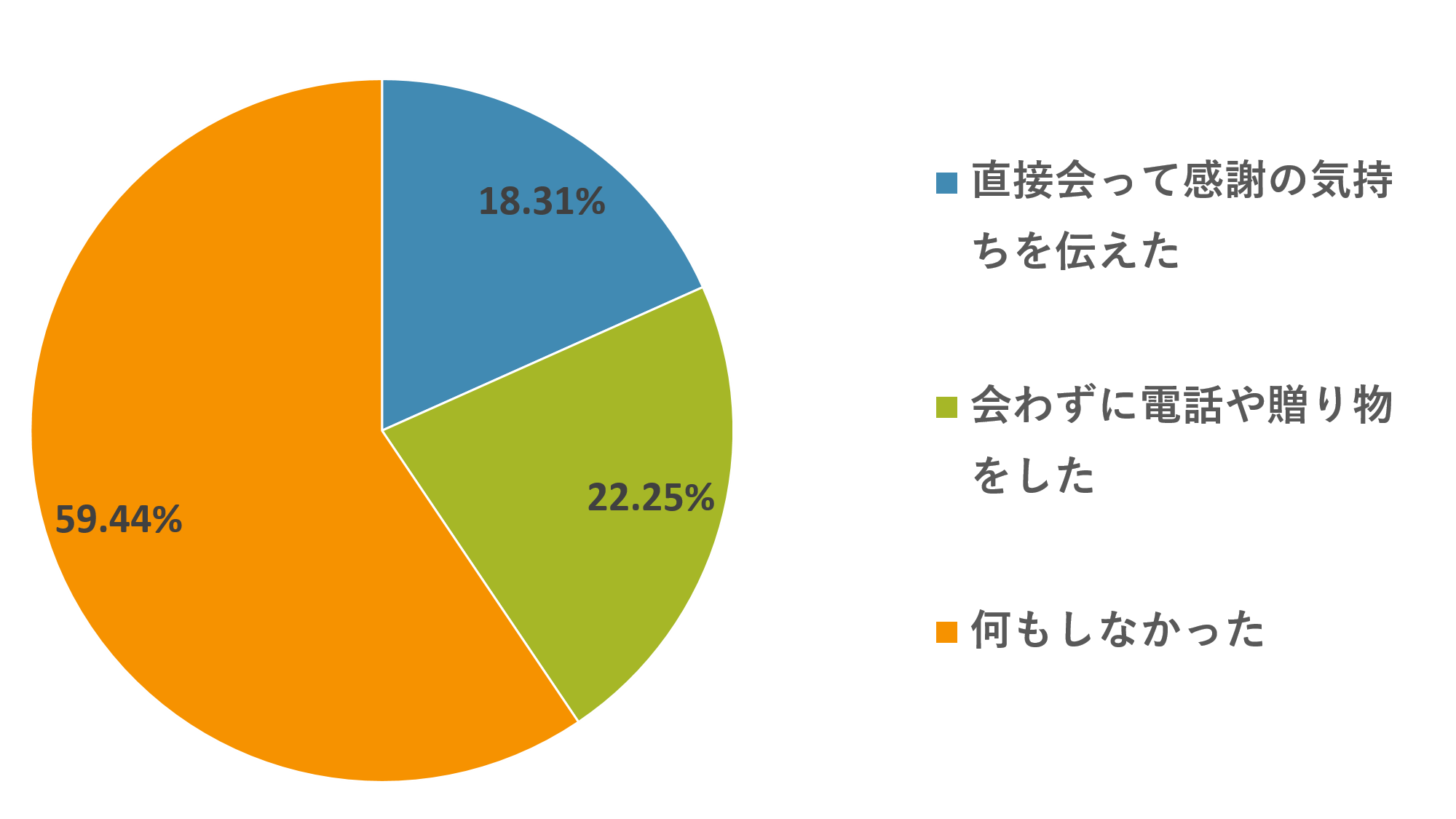 「去年の父の日は何をしましたか。」に対し、「直接会って感謝の気持ちを伝えた 18.31%」「会わずに電話や贈り物をした 22.25%」「何もしなかった 59.44%」と回答。