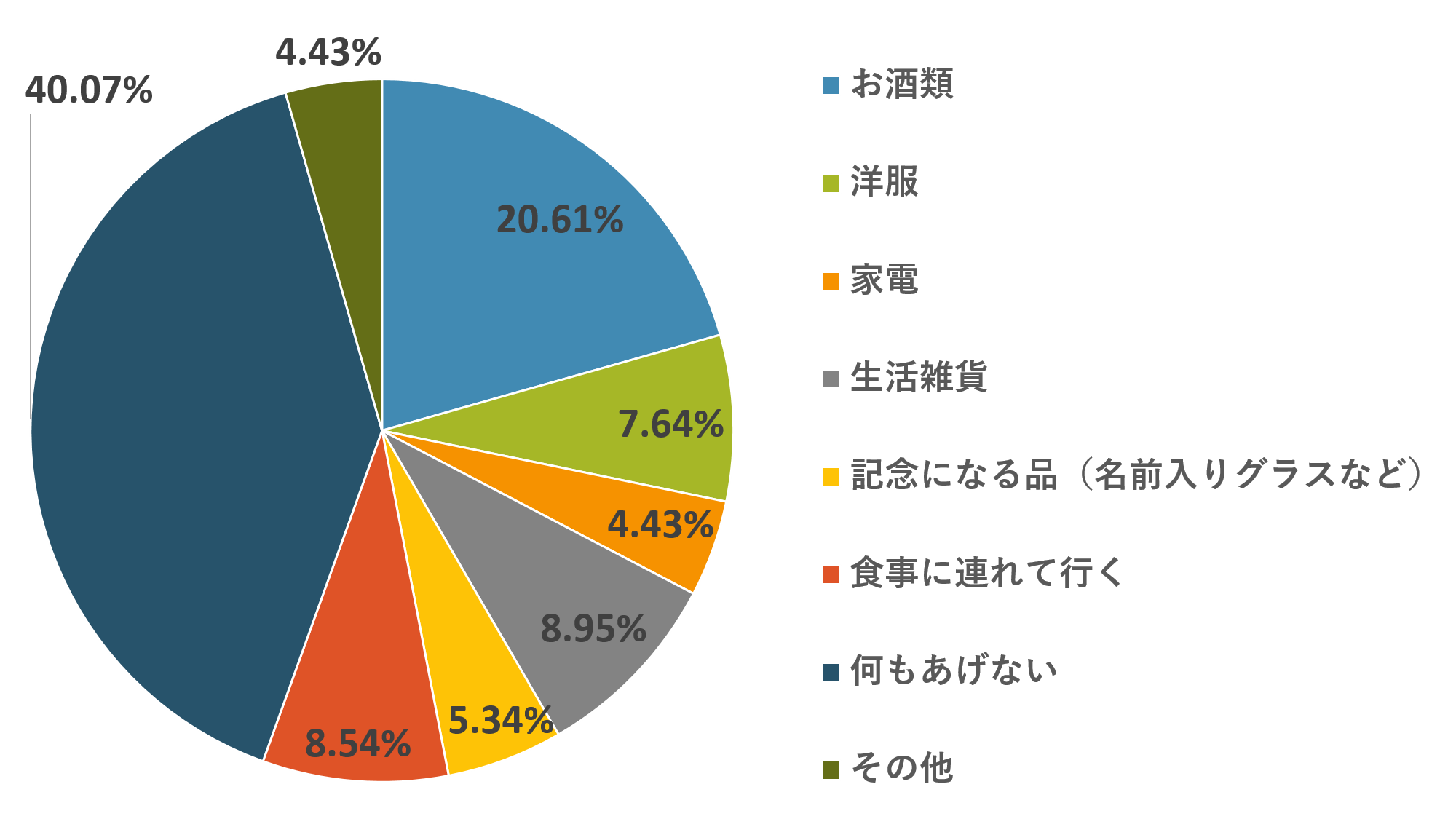 「今年の父の日はどんなプレゼントをあげようと思っていますか。」に対し、「お酒類 20.61%」「洋服 7.64%」「家電 4.43%」「生活雑貨 8.95%」「記念になる品(名前入りグラスなど) 5.34%」「食事に連れて行く 8.54%」「何もあげない 40.07%」「その他 4.43%」と回答。