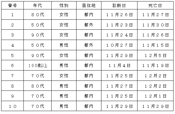 新型コロナウイルスに関連した患者の死亡について business Twitter Facebook はてブ Pocket LINE コピー 2022.12.06 この記事は約1分で読めます。 都内で新型コロナウイルスに感染した方が死亡されましたのでお知らせします。 お亡くなりになった方のご冥福をお祈り申し上げます。 1 新型コロナウイルスに関連した死亡者(本日公表分) ※ 患者・御家族の人権尊重・個人情報保護に御理解と御配慮をお願いします。 2 新型コロナウイルスに関連した死亡者の累計 6,287人