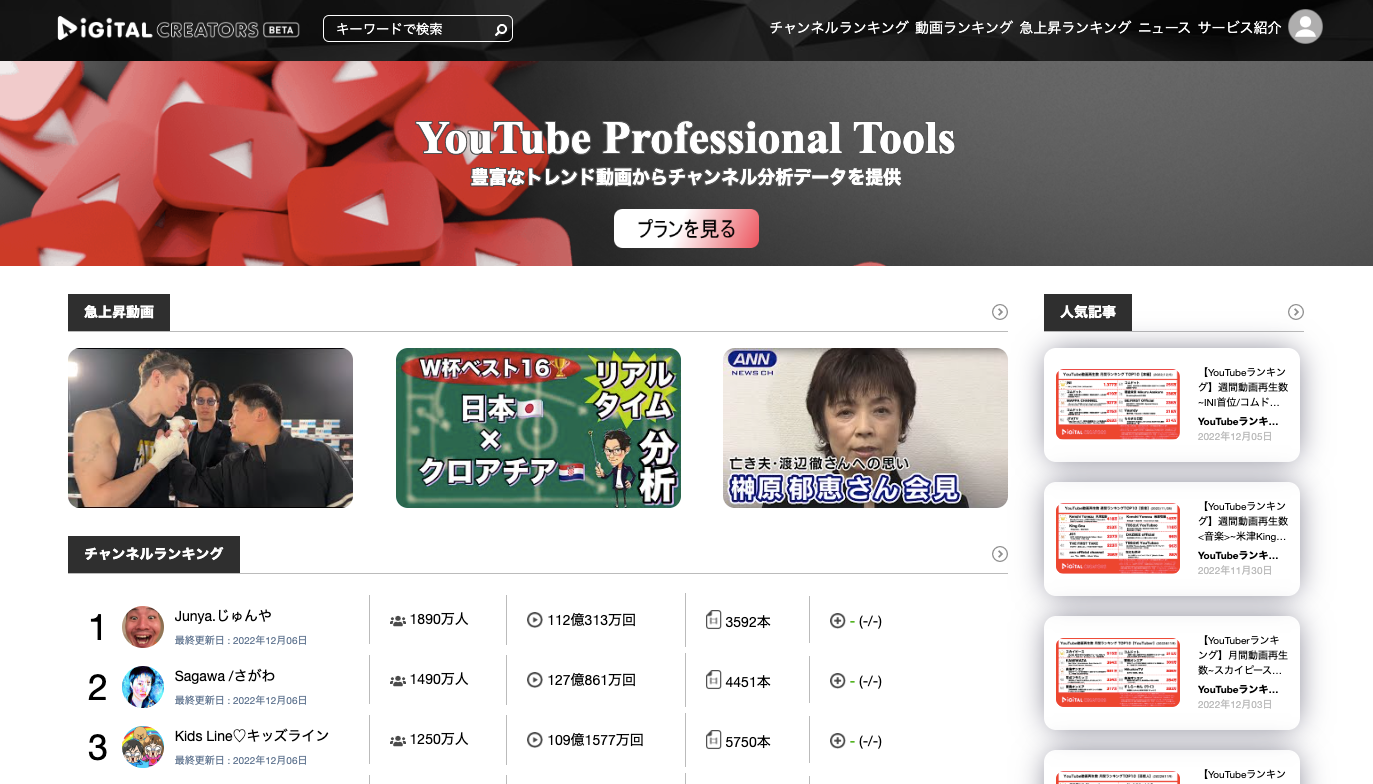 Digital Creatorsは、YouTubeの人気チャンネルや動画などのランキングデーターを無料でチェックできるサイトです。YouTube動画再生数ランキングは、週間ランキングや月間ランキングや年間ランキングなど期間別のランキングのほかに、ジャンル別ランキングなど、様々なデーターを公開していく予定です。