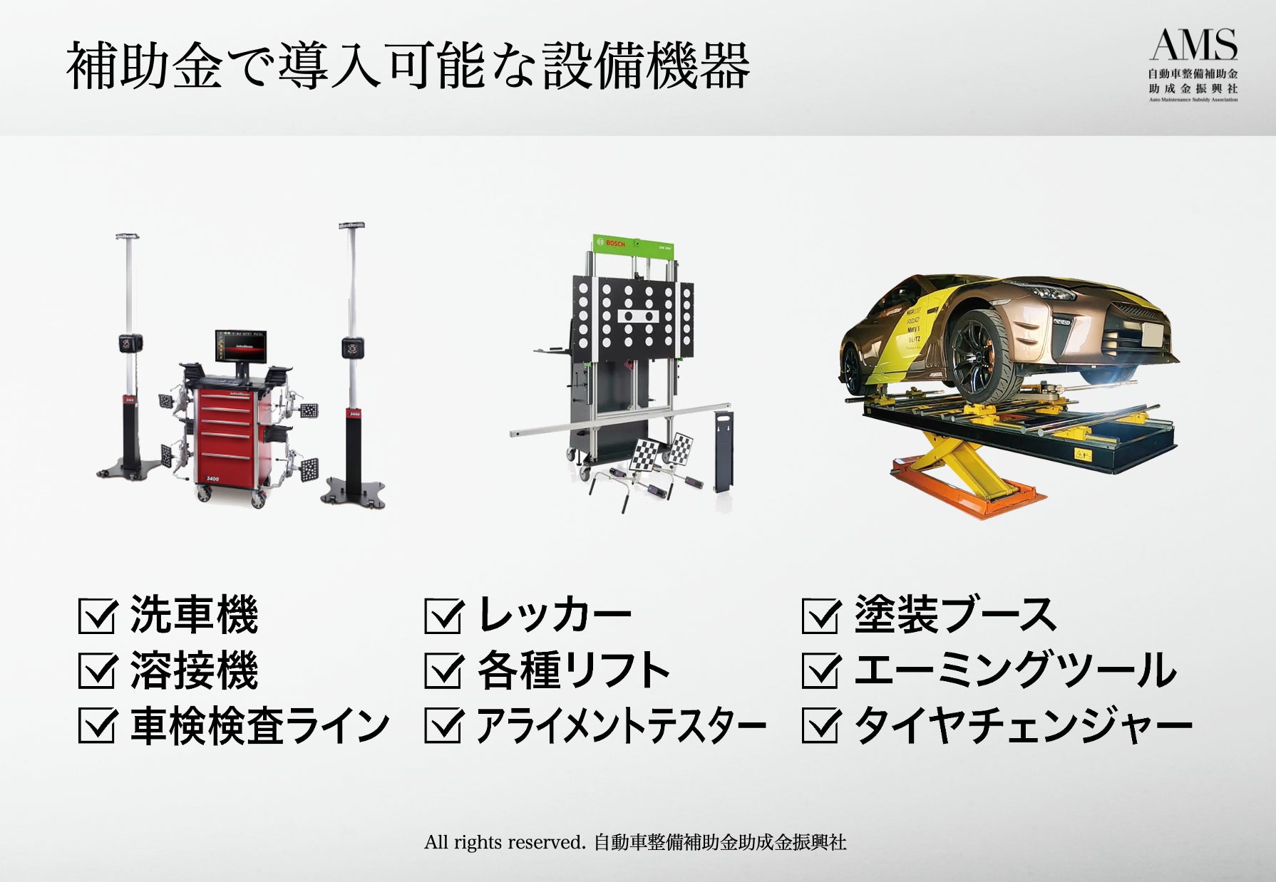 エーミング機器、アライメントテスター、塗装ブース、リフト、フレーム修正機・測定器、レッカー、洗車機、車検検査ライン、タイヤチェンジャー、その他各種自動車整備機器