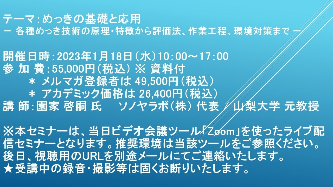 本セミナーでは、多分野で使用されている各種のめっき技術について原理、特徴、適用例について説明し、めっき皮膜の評価法についても述べる。また、実際のめっき作業工程での留意点について説明する。更に、めっき排水の処理など環境対策についても紹介したい。本セミナーは製造メーカーで、設計・製造に携わる技術者に大いに役立つと考える。