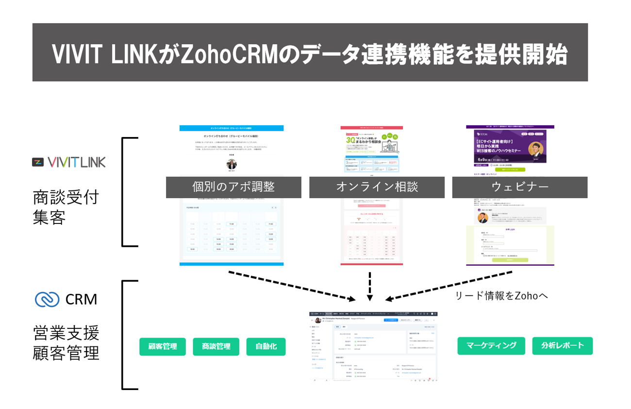 「VIVIT LINK(ビビットリンク)」と「ZohoCRM」を連携させることにより、「VIVIT LINK(ビビットリンク)」で取得したオンライン商談やウェビナー申込みのお客様データを「ZohoCRM」にリアルタイムに自動連係することができます。