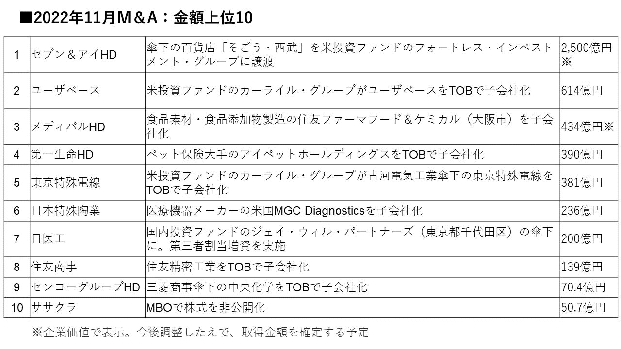 最高金額は、セブン&アイ・ホールディングスが傘下の百貨店「そごう・西武」(東京都豊島区)を、米投資ファンドに2000億円超で売却する案件。