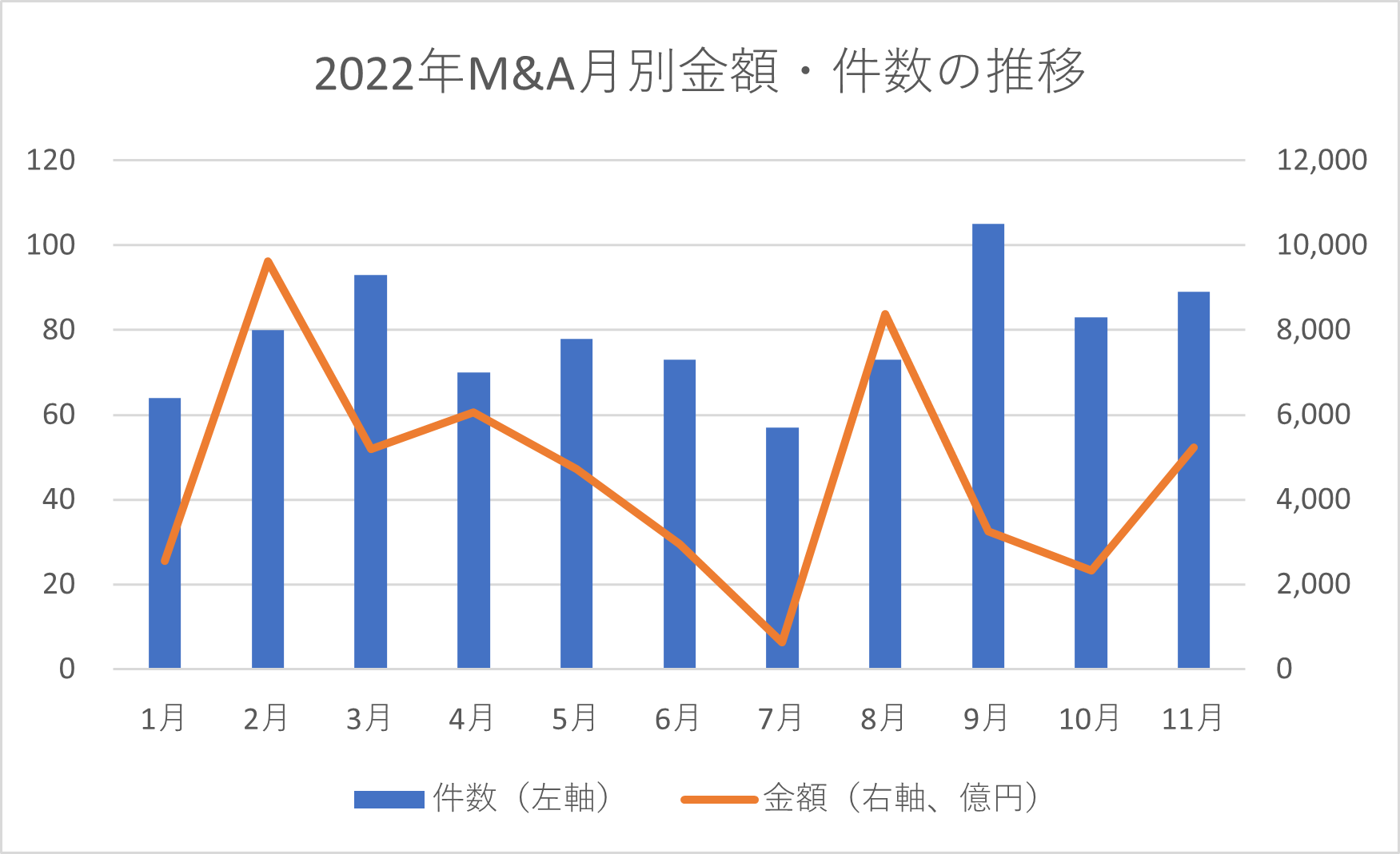 11月の取引金額(公表分を集計)は、5234億円と今年4番目の水準でした。1000億円を超える大型の案件が複数ありましたが、金額非公開の案件があり、数字上は大きく伸びませんでした。