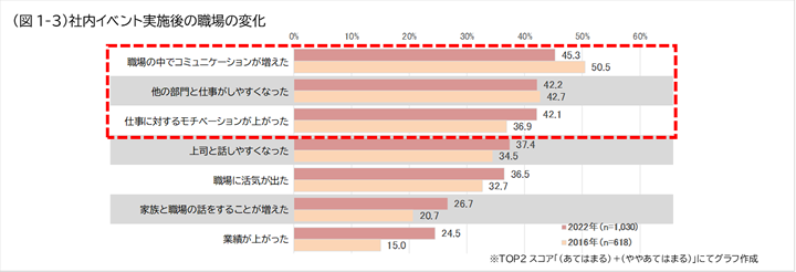社内イベント実施後の職場の変化について聞いたところ、全体では、「職場の中でコミュニケーションが増えた」(45%)が最も高く、以下、「他の部門と仕事がしやすくなった」(42%)、「仕事に対するモチベーションが上がった」(42%)が上位に挙がっています。コロナ禍以前の2016年調査と比較すると、「職場の中でコミュニケーションが増えた」が減少し、「仕事に対するモチベーションが上がった」が増加するという変化がありましたが、順位に変化はなく、社内イベントが職場にもたらす効果はコロナ禍以前と概ね同様であることがわかりました。(図1‐3)
