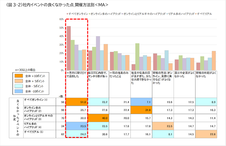 社内イベントの良くなかった点の上位7項目を、開催方法別にまとめたところ、オンライン比率が高い場合は、退屈、話が長すぎるなどの不満を生む可能性があることが示されました。(図3-2)
