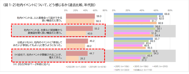 1-2.社内イベントは、「人と直接会って話ができる良い機会」59%、20代では70%。