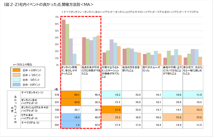 「社員全員が同時に同じ体験ができたこと」は、コロナ禍以前の調査「社員全員が同じ場所に集まったこと」と比較すると9ポイント減少しましたが、2位にランキングされており、3位もコミュニケーションに関する内容でした。1位の参加しやすさという利便性とともに、一体感や交流という情緒面の要因も重要であることがわかります。(図2-1)