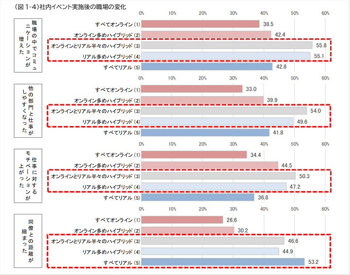 1-4.社内イベントの効果は、リアルの比率が「半々」か「多め」で最大に。