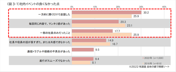 社内イベントの良くなかった点について聞いたところ、「一方的に聞くだけで退屈した」(30%)が最も高く、「毎回同じ内容で、マンネリ感があった」(20%)、「一部の社員のみだったこと」(18%)、が挙げられました。コロナ禍以前の調査と比較すると、「一方的に聞くだけで退屈した」が突出する結果となりました。
