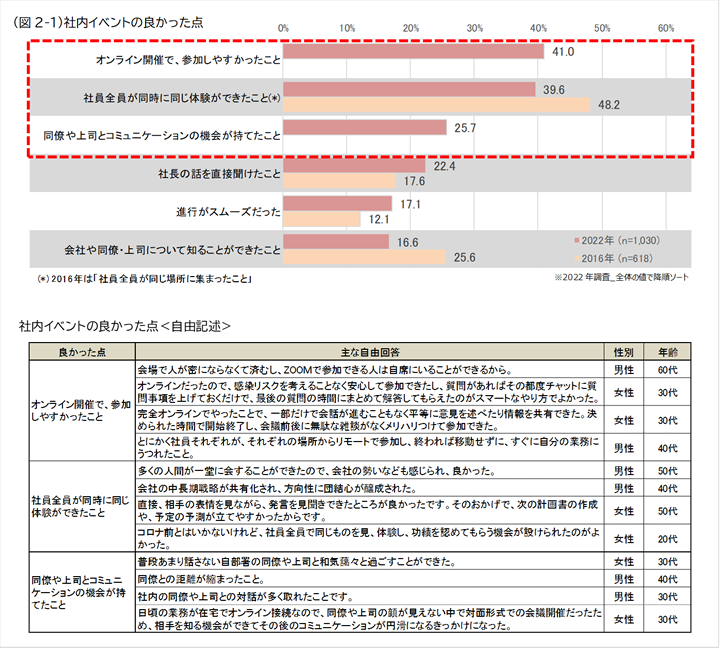 また、自由記述には、「感染リスクを考えることなく安心して参加できた」「社員それぞれが、それぞれの場所からリモートで参加」などの参加しやすさを評価するコメントのほか、「多くの人が一堂に会することができたので、会社の勢いなども感じられ、良かった」、「社員全員で同じものを見、体験し、功績を認めてもらう機会があったのがよかった」などの全員が同じ体験をすることを評価するコメントや、「普段あまり話さない同僚や上司と和気藹々と過ごすことができた」といった、コミュニケーションを評価するコメントが並びました