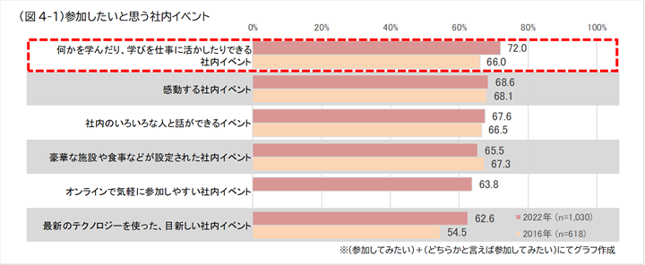 参加したいと思う社内イベントについて聞いたところ、「何かを学んだり、学びを仕事に活かしたりできる社内イベント」(72%)が最も多く、次に「感動する社内イベント」(69%)、「社内のいろいろな人と話ができるイベント」(68%)、「豪華な施設や食事などが設定された社内イベント」(66%)、が、ほぼ同じ割合で選ばれました。(図4-1)