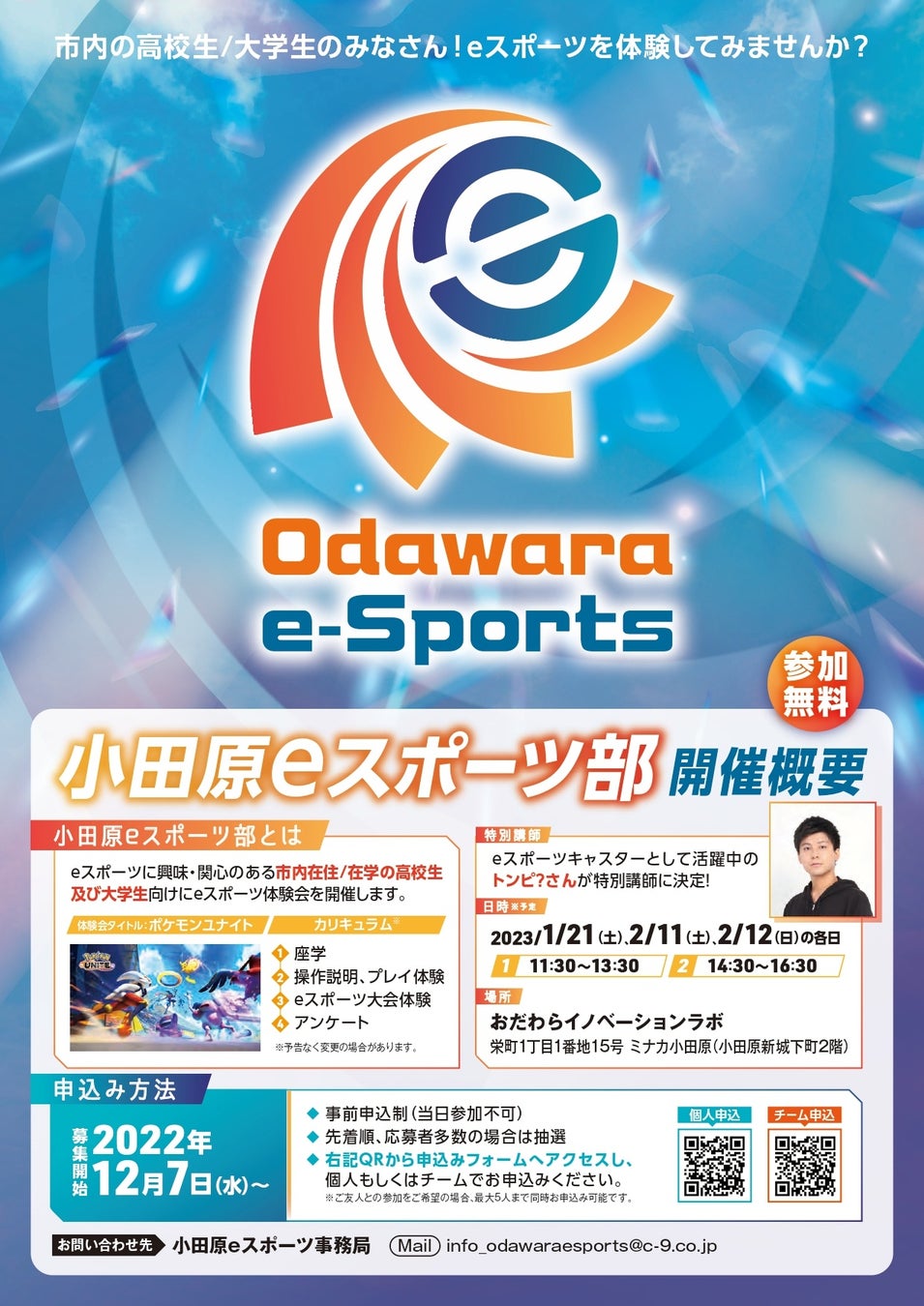 最初の「小田原eスポーツ部」体験会のタイトルは、3月に本市にて大会の開催を予定している「ポケモンユナイト」。eスポーツの楽しさを味わってもらうため、基本の操作説明から、チームに分かれてのeスポーツ大会体験も実施します。