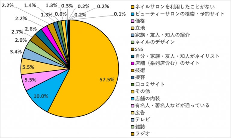 利用するネイルサロンの決め方については、「ネイルサロンを利用したことがない」57.5%の人を除くと、「ビューティーサロンの検索・予約サイト」が10.0%、「価格」「立地」が5.5%という順になりました。スマホやパソコンで手軽に調べられますので、検索サイトを利用して決めている方が多いようですね。