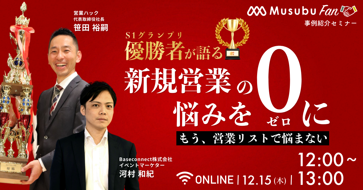 そんなお悩みに対して本ウェビナーは、法人営業を支援するクラウド型企業情報データベース「Musubu」を提供するBaseconnect株式会社と企業の新規開拓営業支援を行う株式会社営業ハックがコラボでお送りします。営業ハック代表笹田からは、新規営業活動における「売れる営業パーソンの考え方と活動」についてもお話させていただきます。皆様の「営業の悩みを0にする」お時間になれば幸いです。