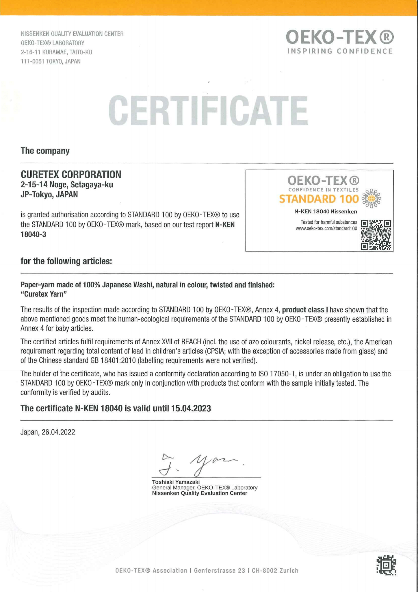 和紙繊維〈CURETEX®〉は、繊維製品の国際的安全基準「エコテックス®スタンダード100」を取得しています。からだへのやさしさ、環境への配慮が客観的に証明されています。