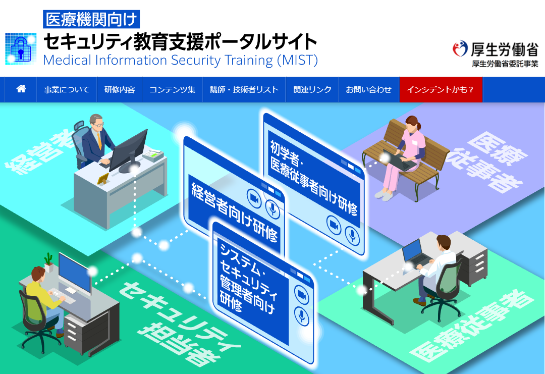 近年、国内外の医療機関を標的とした、サイバー攻撃による被害が増加しており、我が国においても、世界各国と同様にリスクが高まっています。国内の医療機関においても、サイバー攻撃により長期に診療が停止する事案が発生していることから、医療機関等におけるサイバーセキュリティ対策の充実は喫緊の課題となっています。また、令和4年度の診療報酬改定では、許可病床400床以上の保険医療機関について、専任の医療情報システム安全管理責任者より職員を対象に、少なくとも年1回程度の定期的に必要な情報セキュリティ研修を実施することを診療録管理体制加算に加えられたといった背景があります。これら背景のもと、本事業では、更なる医療機関のサイバーセキュリティ対策の徹底を図るべく、経営層や医療従事者等へのセキュリティ対策研修を実施いたします。それに伴い、医療機関向けセキュリティ教育支援ポータルサイト(MIST:Medical Information Security Training)を開設いたします。研修の申し込みをはじめ、サイバーセキュリティ教育に活用できるコンテンツ集の掲載など医療機関向けに継続的な教育支援をいたします。この機会に是非、ポータルサイトをご活用いただき、研修にご参加ください。