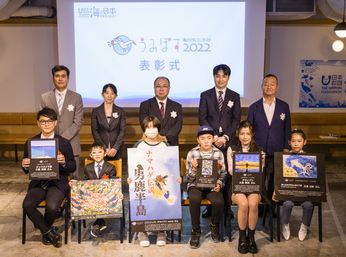おひとりずつに賞状と副賞の授与をした後、うみぽす2022の審査員一同も受賞者と一緒に記念撮影を実施。この日参加した受賞者の皆さんも、作品の表彰を受けとても喜んでいました。この日の式の様子はYouTubeでライブ配信した後、アーカイブでも動画の配信を行っています。
