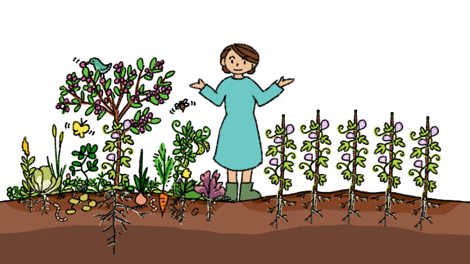 作物を収穫することが主目的ではなく、生態系の拡張原理を学ぶことに主眼が置かれており、果樹を中心に一年草や多年草、苔、シダなど多種多様な植物を混ぜて育て、それぞれの相互作用を観察します。また、生態系の循環を阻害しないために肥料や農薬は使用せず、表土の破壊をもたらす耕起なども行いません。他の場所での実践と比較できるよう、こうした一定の条件に沿ってシネコポータルは構成されています。