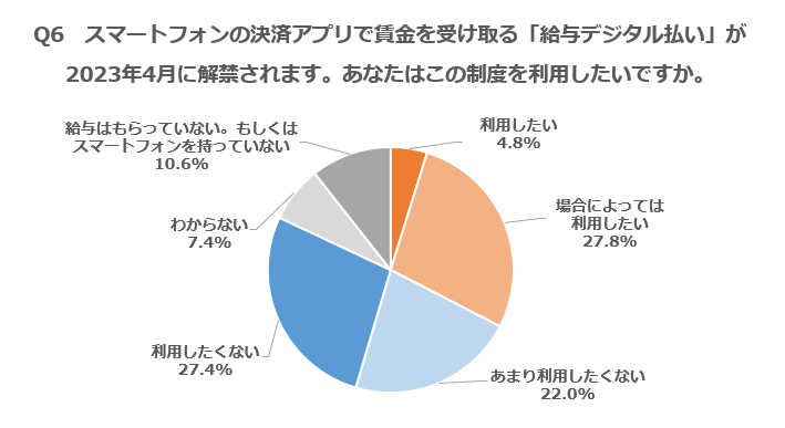 - 給与デジタル払いを「利用したくない」「あまり利用したくない」は計49.4%で、「利用したい」「場合によっては利用したい」の計32.6%を上回った。(Q6)