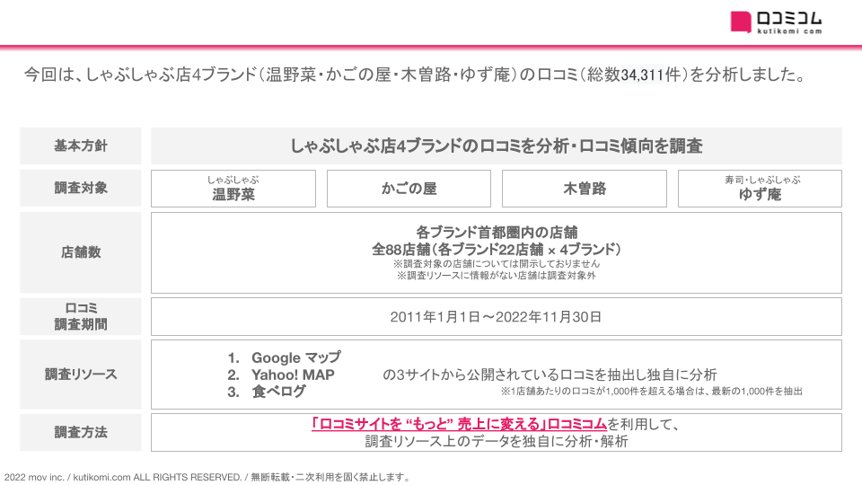 今回は、しゃぶしゃぶ店4ブランド(温野菜/かごの屋/木曽路/ゆず庵)の口コミ(総数34,311件)を分析しました。