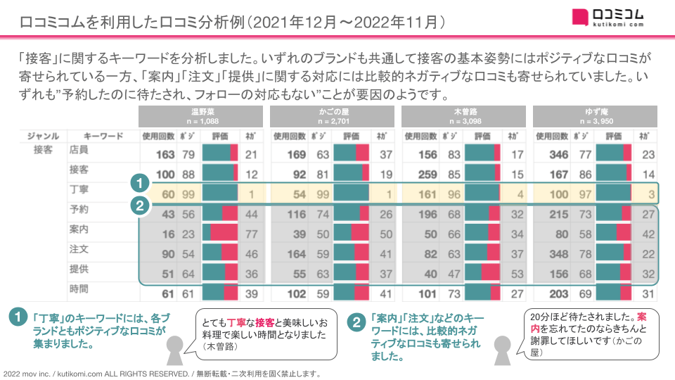 「接客」に関するキーワードを分析しました。いずれのブランドも共通して接客の基本姿勢にはポジティブな口コミが寄せられている一方、「案内」「注文」「提供」に関する対応には比較的ネガティブな口コミも寄せられていました。いずれも”予約したのに待たされ、フォローの対応もない”ことが要因のようです。