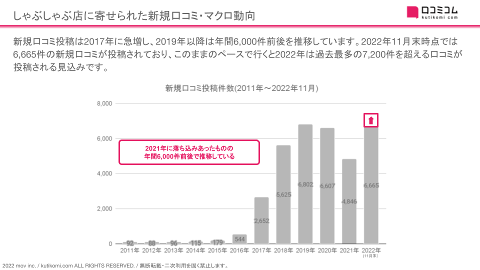 新規口コミ投稿は2017年に急増し、2019年以降は年間6,000件前後を推移しています。2022年11月末時点では6,665件の新規口コミが投稿されており、このままのペースで行くと2022年は過去最多の7,200件を超える口コミが投稿される見込みです。