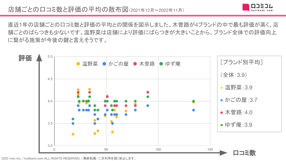 木曽路が4ブランドの中で最も評価が高く、店舗ごとのばらつきも少ないです。