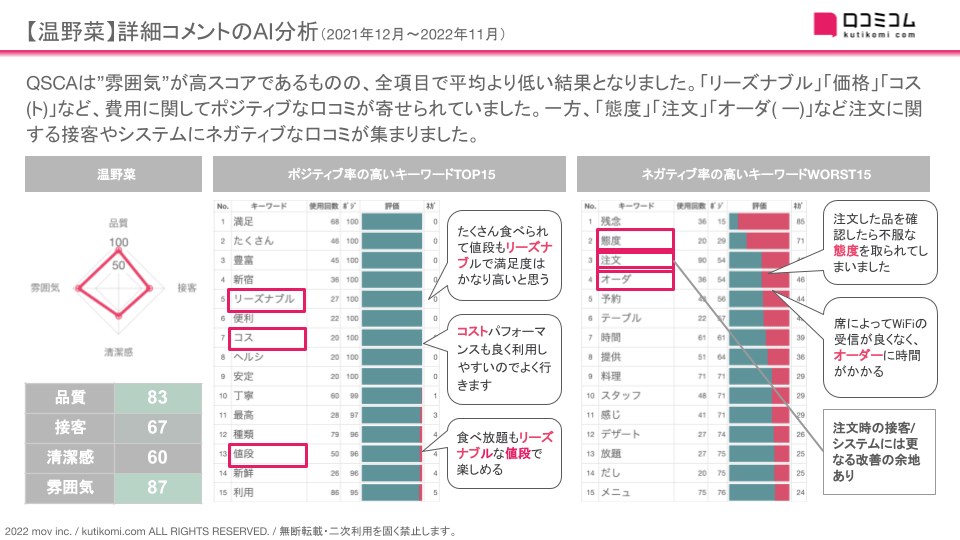 それらのAI解析を用いた分析例として「温野菜」のQSCA・頻出ポジネガキーワードを確認しました。