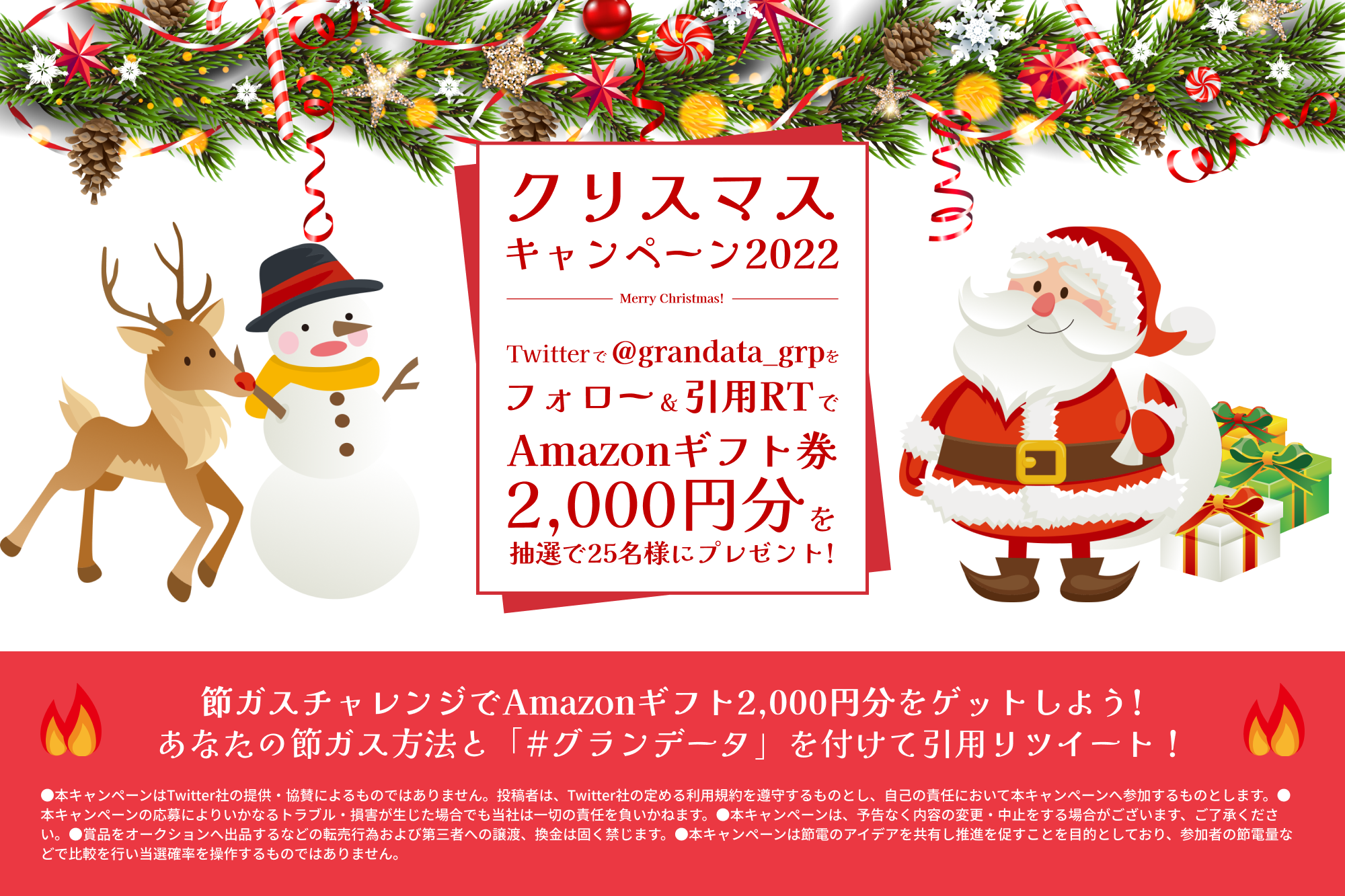 「エネルギーから新しい仕組みをつくる」というミッションを掲げ、「エネルギー×賃貸管理」のデジタル化を進めている株式会社グランデータ(本社:東京都豊島区、代表取締役社⻑:⼿島太⼀、以下「グランデータ」)は、2022年12月8日(木)〜12月31日(土) の期間、グランデータ公式Twitterアカウントにて『クリスマスキャンペーン2022』と題し、抽選で25名様にAmazonギフト券2,000円分をプレゼントするキャンペーンを実施していることをお知らせいたします。