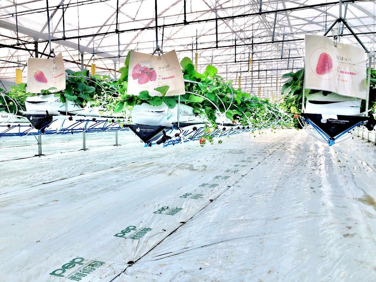 イチゴ狩りと言えば地面に直接植えてある「露地栽培」とパイプなどで収穫しやすいように台を作って収穫する「高設ベンチ栽培」が一般的です。しかし、この度井上寅雄農園ではローカル10000を使って農業用ハウスはフランス、栽培設備はスペインから輸入したイチゴが上から降ってくるようなハンギング方式を採用しました。ハンギング方式の採用により地面に障害物はなくお子さんも安心してイチゴ狩りをすることができます。