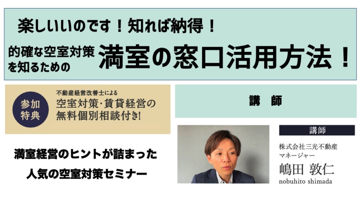 2022年11月12日(土)に開催した「実際の事例も大公開!最新賃貸経営セミナー」では、最新の賃貸経営情報を解説いたしました。2022年12月17日(土)のセミナーでは、満室の窓口 札幌店 株式会社三光不動産の嶋田 敦仁氏を講師にセミナーを開催します。当日は、「楽していいのです!知れば納得!的確な空室対策を知るための満室の窓口活用方法!」と題して、最新の不動産市況などをふまえた満室経営実現のヒントを詳しく解説します。