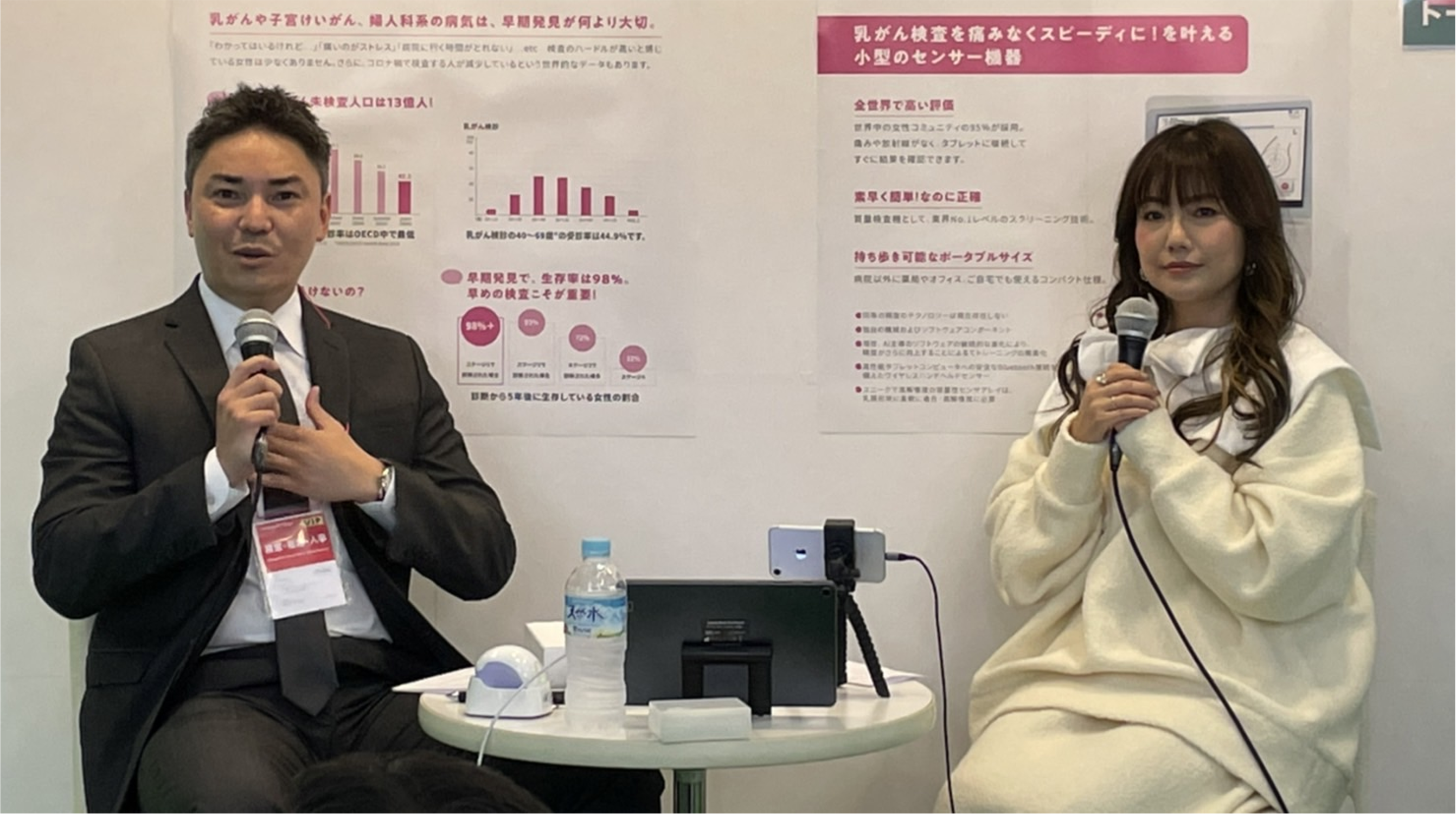 また、ICheck取締役のリチャード・カシンスキー博士(医師)とアーティストでICheckのアンバサダーを務める島谷ひとみ執行役員のFemtech Tokyoブースでのトークセッションも行われました。多くの来場者が足をとめて、対談のなかでリチャード博士が話された、乳がんを早期発見できれば、5年後の生存率がほぼ100%であることなどに高い関心を示されていらっしゃいました。