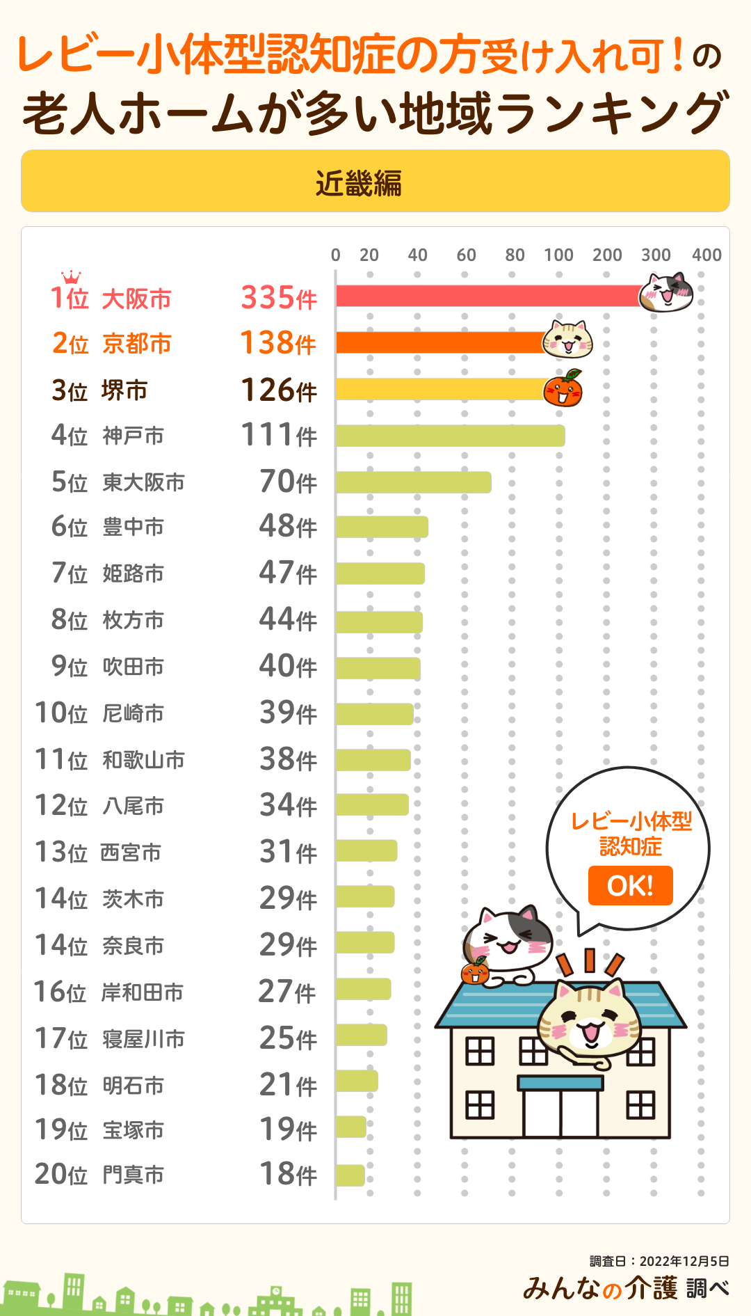 近畿エリアの「レビー小体型認知症の方を受け入れ可能な老人ホーム」の総数は1,748件。1位は大阪市で335件。次いで、2位は京都市で138件、3位は堺市で126件でした。