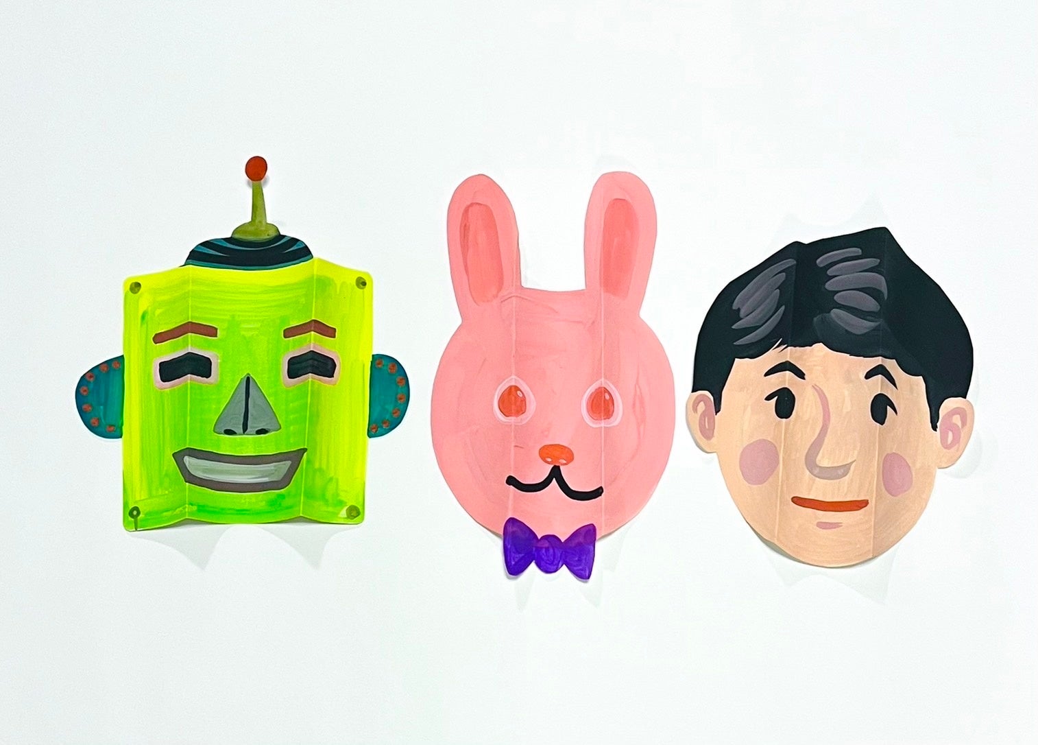 表情の変わる大きなお面を作ります。「顔」をテーマに人に限らず、ネコ・犬・宇宙人・ロボットなど、 思い思いのお面を絵の具で描いてみましょう。
