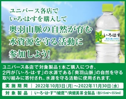 このキャンペーンは、2022年10月3日(月)から11月30日(水)までの期間、ユニバース57店舗において展開し、期間中の対象製品1本ご購入につき2円が豊沢川土地改良区へ寄付され、「い・ろ・は・す」の水源を守るための環境保全活動などに役立てられるものです。このたびの対象製品は「い・ろ・は・す」、「綾鷹」、「爽健美茶」の3ブランド9品目とし、売上本数は251,249本、寄付金額は502,498円となりました。なお、2018年から開始したこの取り組みによる寄付金の総額は、このたびのものを含め2,098,734円となります。