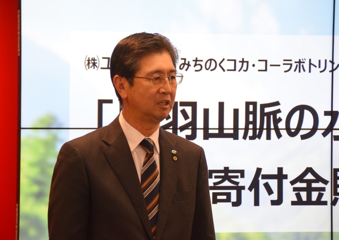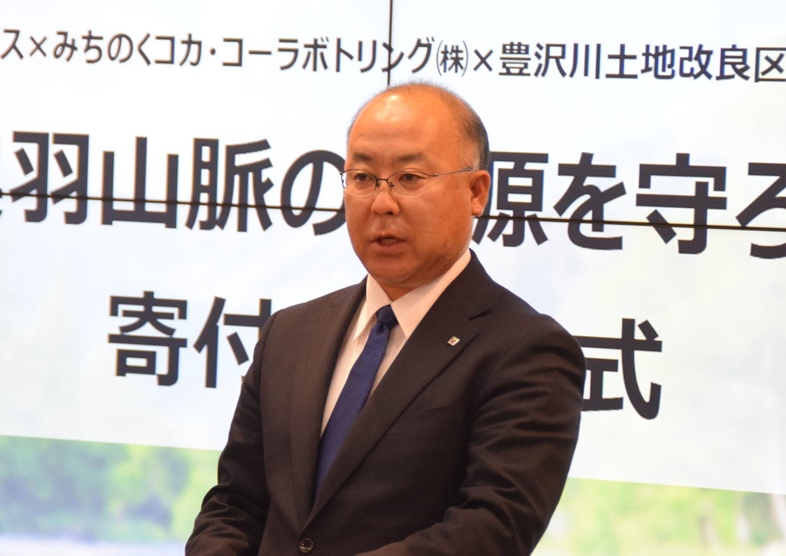 「当社が販売しているコカ・コーラ社製品は、花巻市にある当社工場にて製造しており、製品を作る上で何よりも大事なものが『水』です。その大切な水源を守る活動を、豊沢川土地改良区様のご協力を得ながら取り組んでおります。また、ユニバース様におかれましても、リサイクル素材を使用した商品や、環境にやさしい原材料を使用した商品を販売するなど、様々な環境負荷低減に取り組んでおられます。今後も、より良い地域づくりに向けて協働しながら、お互いの企業価値を高めるパートナーとして、継続した取り組みをさせていただければと思っております。」