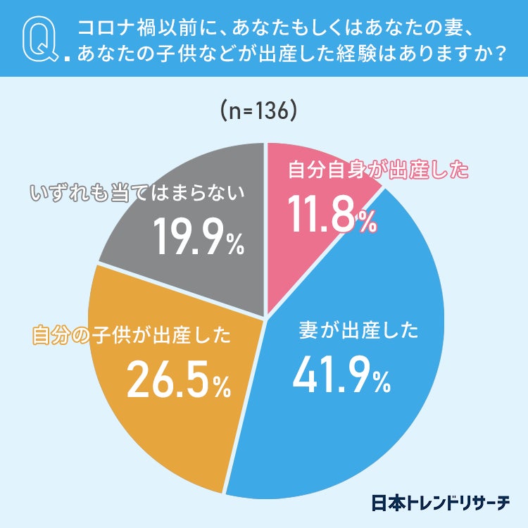 続いて、自分自身もしくは自分の妻、自分の子供などがコロナ禍以前に出産した経験があるかについて聞きました。