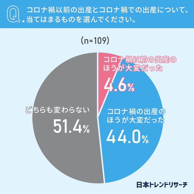 また、コロナ禍以前とコロナ禍での出産ではどちらのほうが大変だったかの問いでは、44%の方が「コロナ禍の出産のほうが大変だった」と回答しました。
