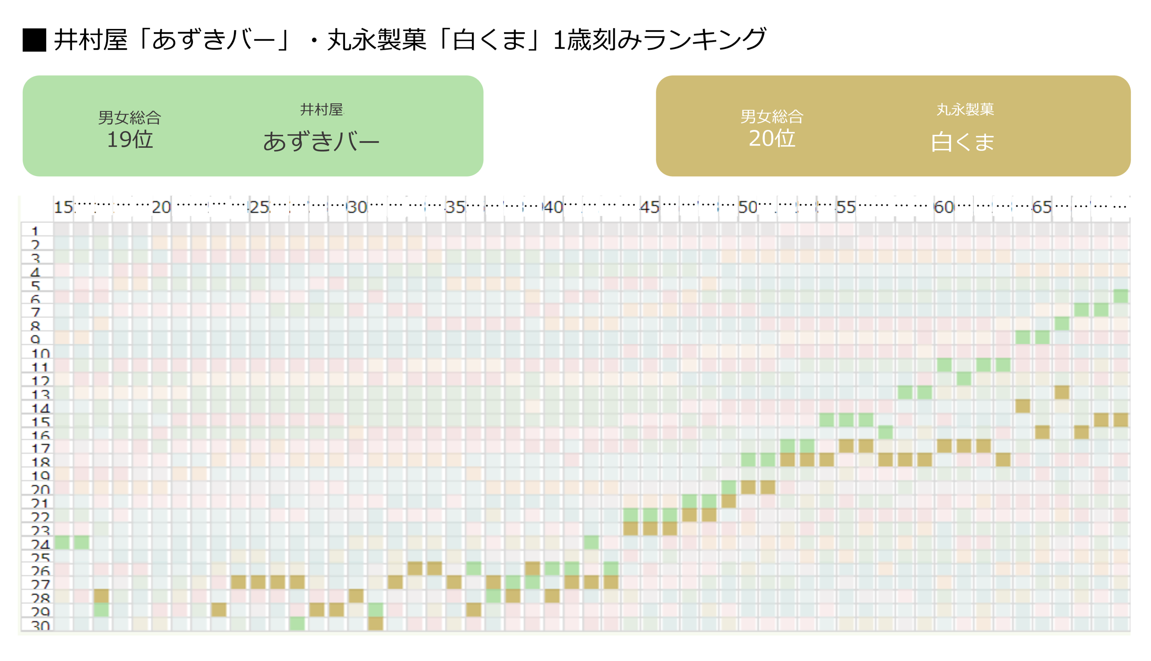 井村屋「あずきバー」は27歳時点で30位ですが、69歳になると6位までランクアップしています。丸永製菓「白くま」についても、31歳時点で30位ですが、66歳では13位までランクアップしており、どちらも45歳あたりからランキングが急上昇しています。どちらも昔ながらのブランドなので、より慣れ親しんだ方が、年齢が上がるにつれて購入する機会が増えるのかもしれません。