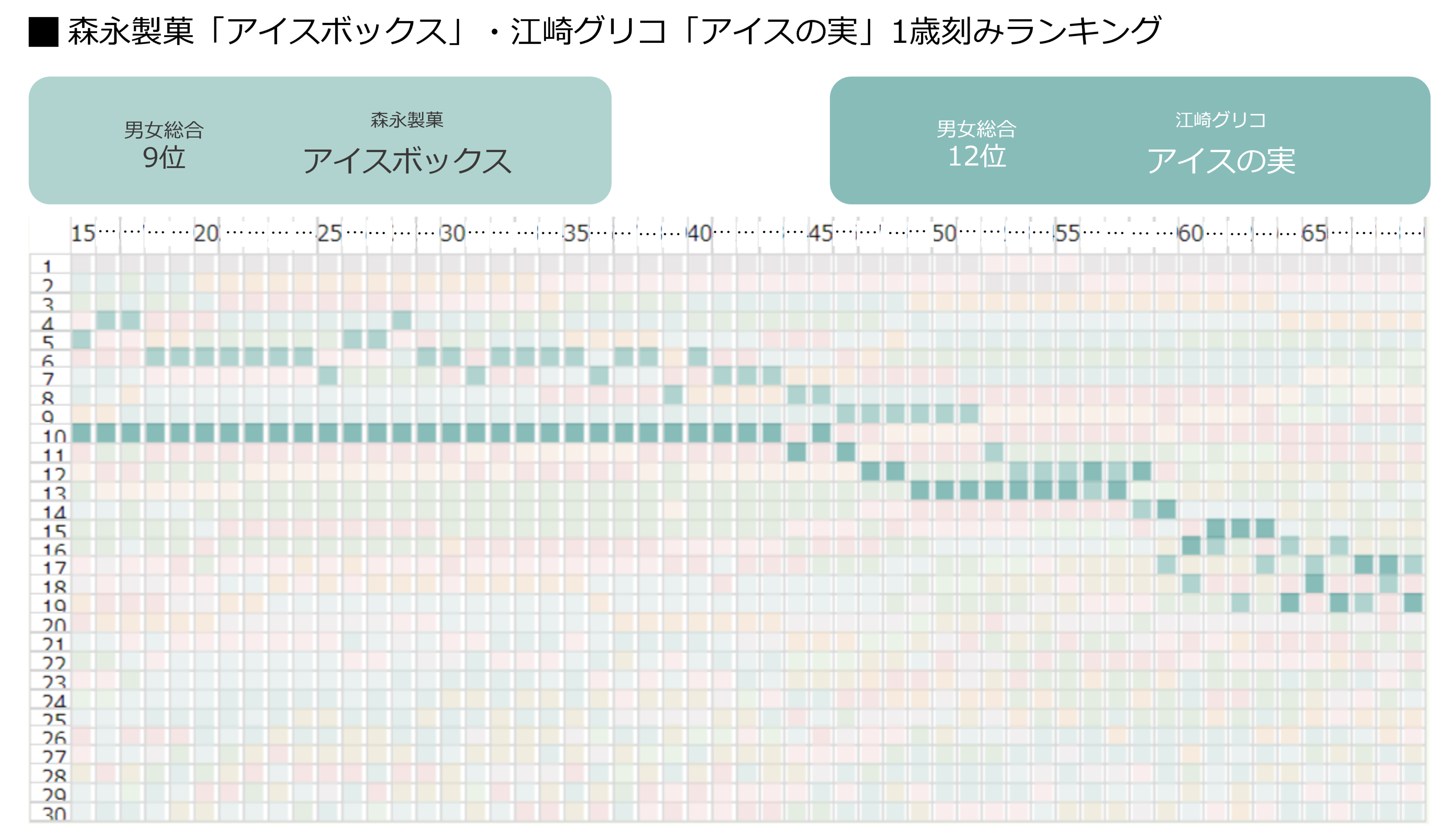 総合9位の森永製菓「アイスボックス」、12位の江崎グリコ「アイスの実」のランキング推移を見てみると、15~43歳まではTOP10以内で一定のランキングを保っていますが、45歳以降になると年齢が上がるにつれてランクダウンしています。