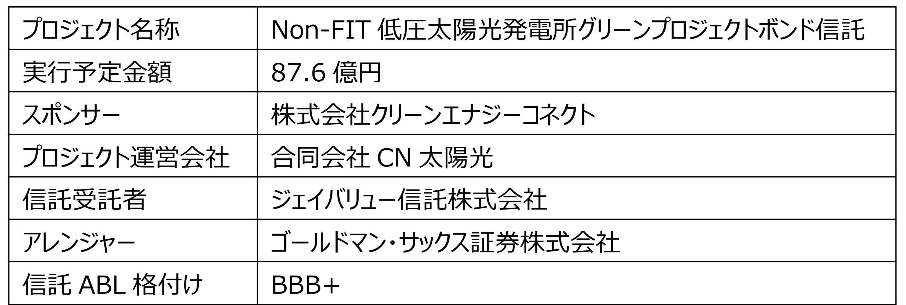 本件資⾦調達の概要は、実⾏予定⾦額が87.6億円、スポンサーは株式会社クリーンエナジーコネクト、プロジェクト運営会社は合同会社CN太陽光、アレンジャーはゴールドマン・サックス証券株式会社、受託者はジェイバリュー信託株式会社です。