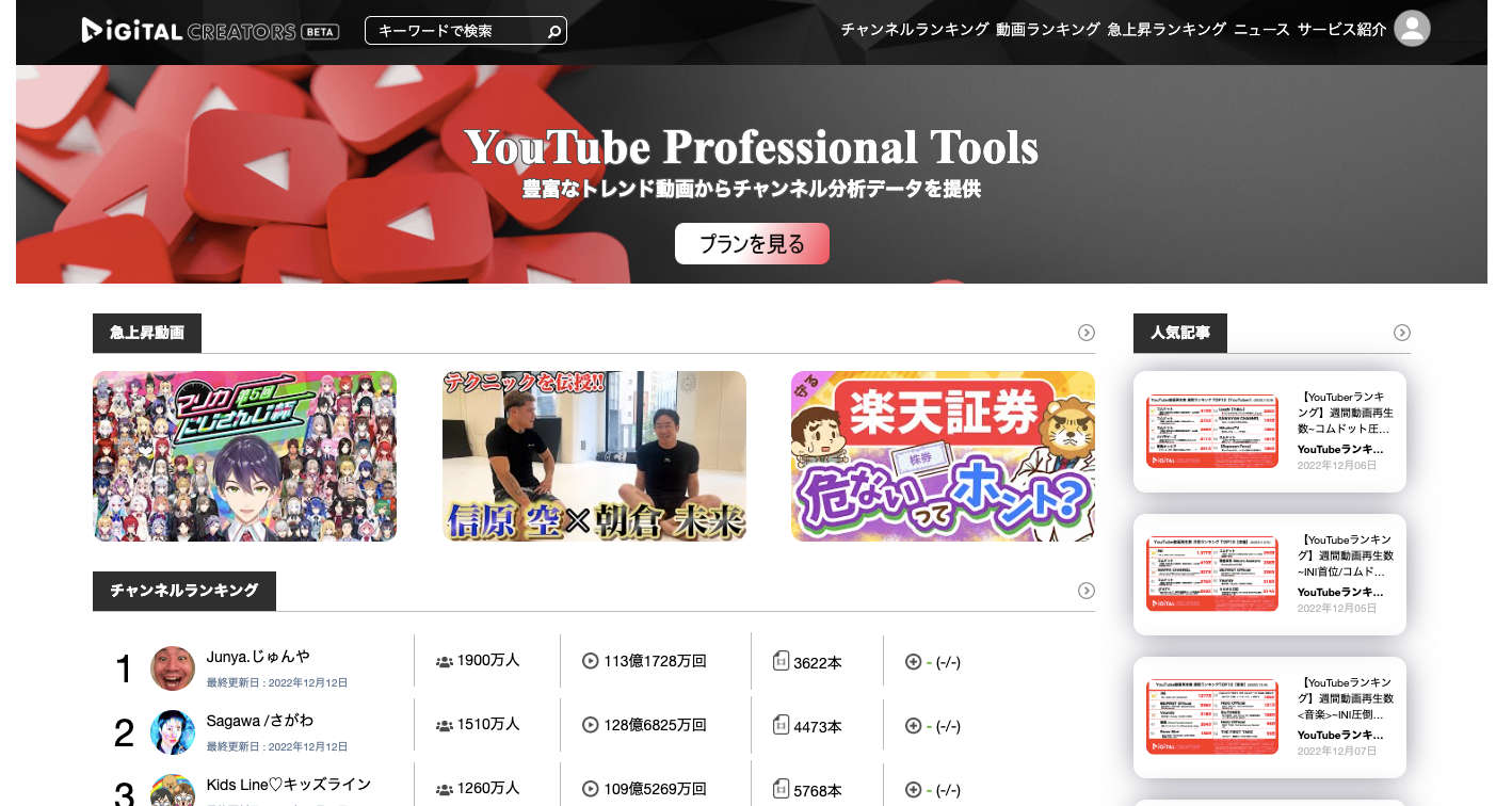 Digital Creatorsは、YouTubeの人気チャンネルや動画などのランキングデーターを無料でチェックできるサイトです。YouTube動画再生数ランキングは、週間ランキングや月間ランキングや年間ランキングなど期間別のランキングのほかに、ジャンル別ランキングなど、様々なデーターを公開していく予定です。