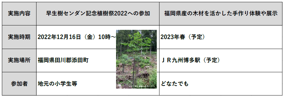 本プロジェクトは、JR九州様と連携することで現在福岡県としても力を入れている早生広葉樹であるセンダンを活用したプロジェクトです。センダンの木を植樹して成木なるまで大切に育て、大川市で製材、加工するにあたり一般社団法人大川スタンドバイツリー様にご協力いただいています。