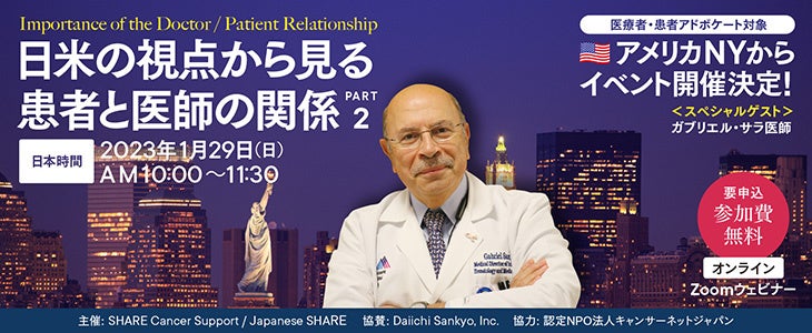 認定NPO法人キャンサーネットジャパン(所在地:東京都文京区 理事長:岩瀬哲)は、米国の乳がん、婦人科がん患者のサポートグループSHARE (所在地:NEW YORK,USA CEO:キャロル・エヴァンス)が主催する医療者や患者アドボケートを対象としたオンラインセミナー「日米の視点から見る、患者と医師の関係 PART2」に協力いたします。
