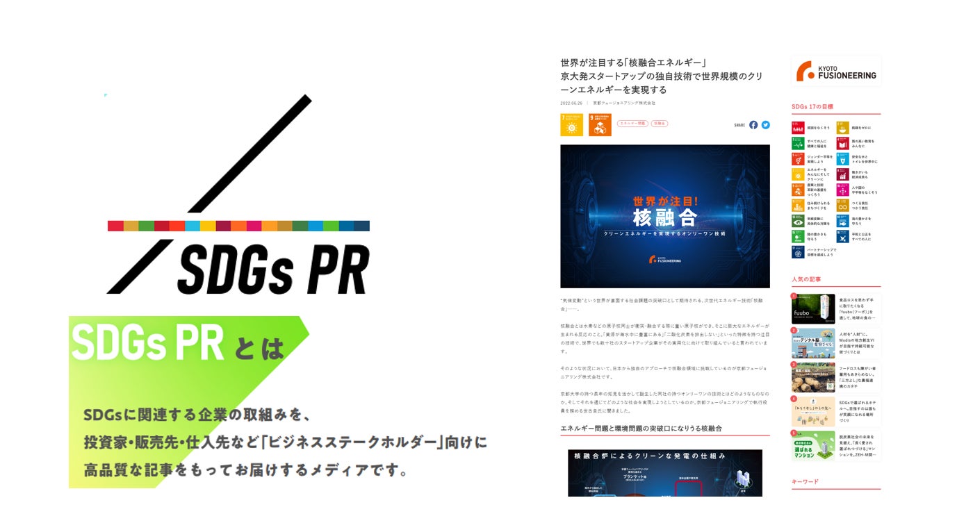 自社サービスのひとつとして、SDGs:持続可能な開発目標(SDGs:Sustainable Development Goals)に関連する企業の取り組みを投資家販売先仕入先などの「ビジネスステークホルダー」向けに高品質な記事を持ってお届けするメディアである「SDGs PR」の運営も行っています。